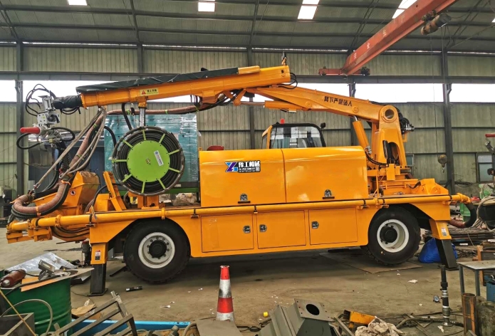 隧道機械手整機高度低,回轉(zhuǎn)半徑小,能夠使用于施工場地受限的工程;同時底盤采用剛性底盤,內(nèi)燃-靜液壓傳動,四輪驅(qū)動,配合四輪同向轉(zhuǎn)向和可旋轉(zhuǎn)駕駛室;四個斜撐式液壓支腿保證底盤在承受噴射機械手施工及料斗進料的動作負荷時具有足夠的穩(wěn)定性。